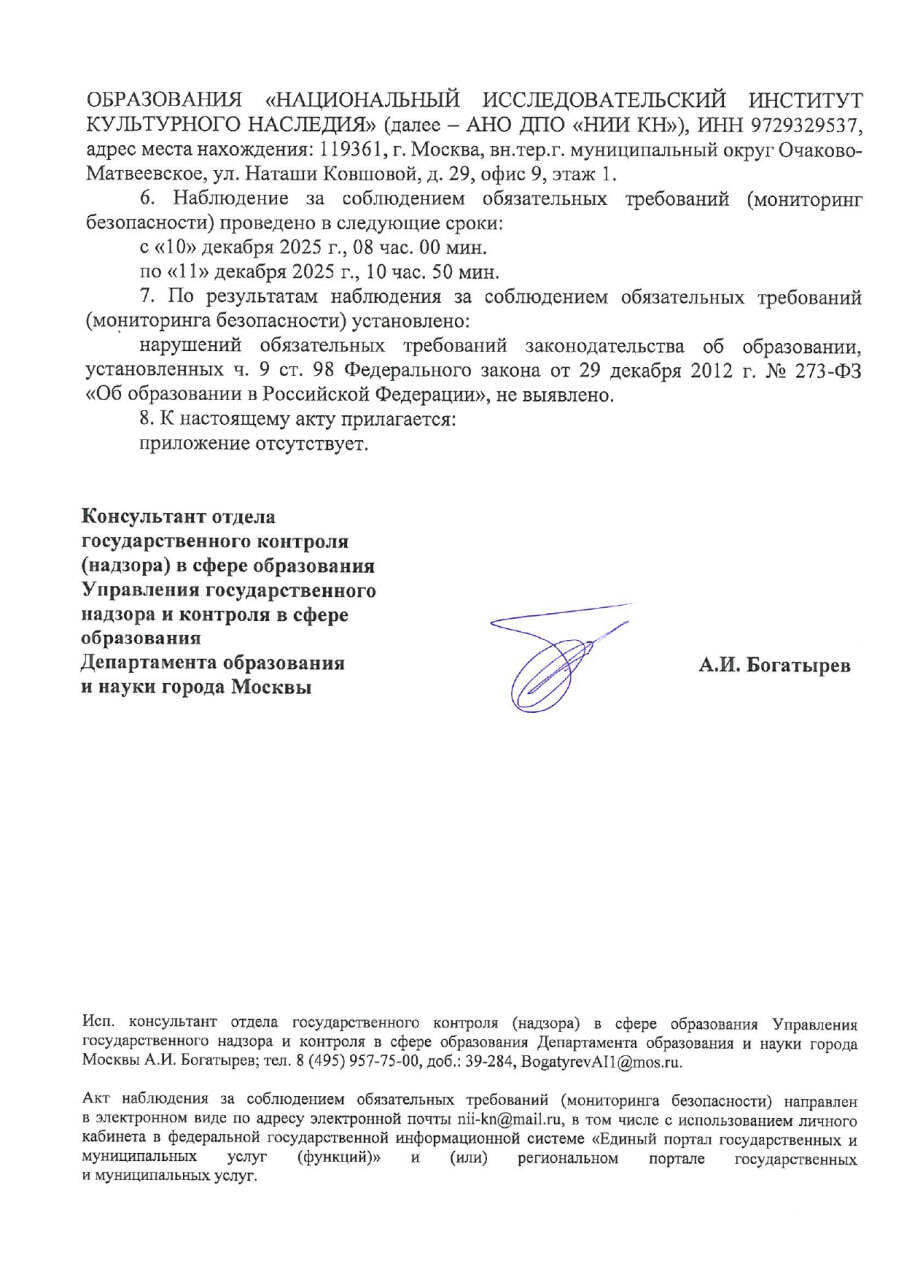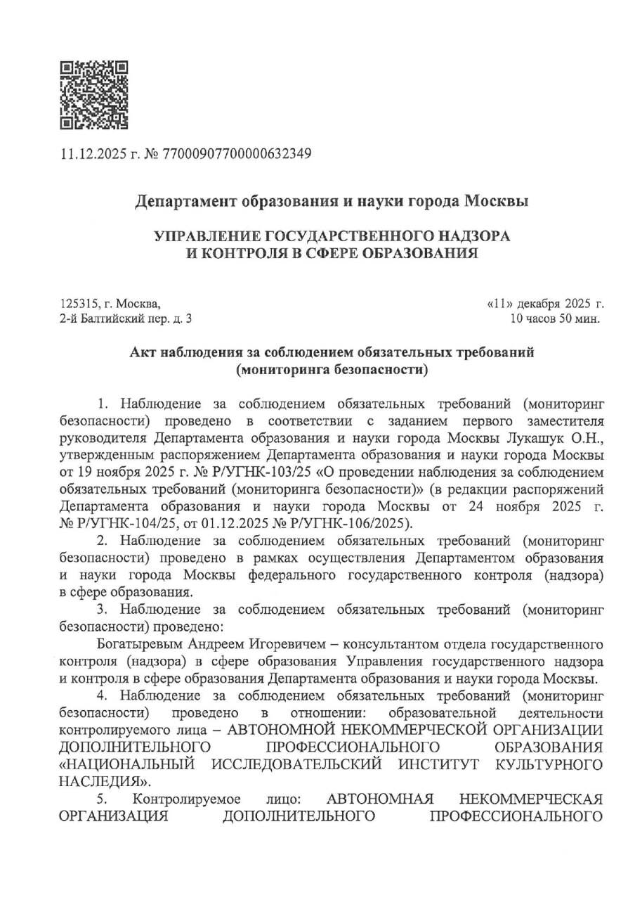 🇷🇺 В декабре 2025 года Департаментом образования и науки города Москвы проведено наблюдение (мониторинг безопасности) за соблюдением Институтом, как держателем образовательной лицензии, обязательных требований законодательства об образовании в РФ, в рамках которого каких-либо нарушений не выявлено